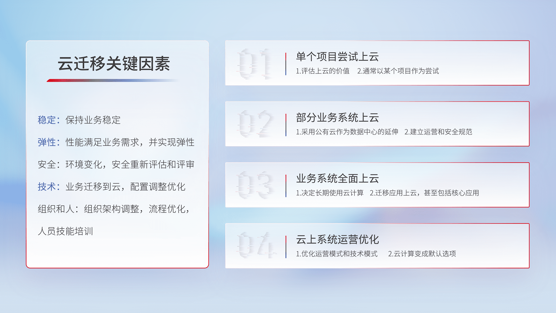 结合实际业务,,,从规划设计、、、、云平台选型、、云原生改造、、数据迁移、、集成交付,,,,迁移全过程为客户识别最佳上云路径,,,做好风险识别管理,,设计网络架构、、、身份权限、、、、安全审计合规、、、操作审计、、、日志审计、、、监控告警策略、、、多站点容灾设计等,,对云上基础设施进行整体规划,,提升IT治理水平,,,以满足弹性、、、高可用、、、高性能的需求。。。